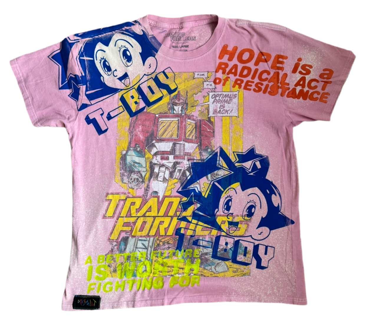 ASTRO T-BOY DESIGN on UPCYCLED TRANSFORMERS SHIRT. EXISTING IS A RADICAL ACT. CLAIMING SPACE— IN SPACE FIGHT FOR A BETTER TOMORROW! DEFENDING THE GALAXY FROM TRANSPHOBIA